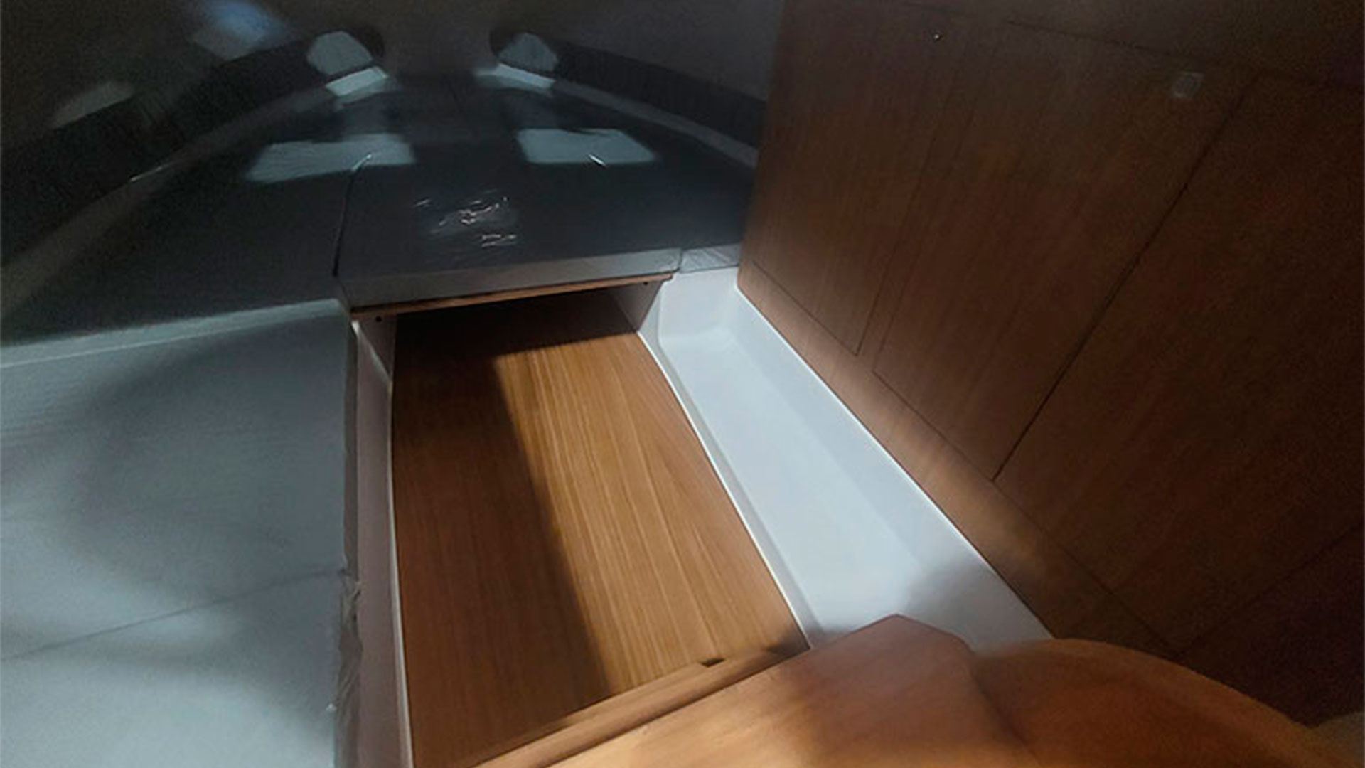 Plataforma de baño en teka e inox con escalera de baño.