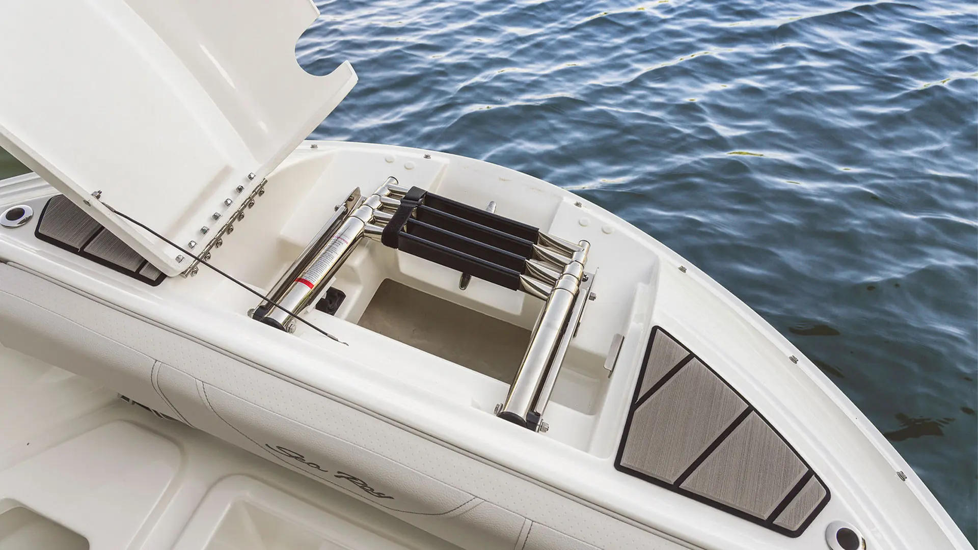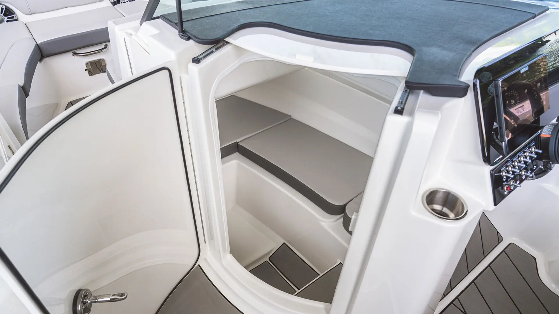 En la proa, los asientos amplios y ergonómicos, junto con los compartimentos de almacenamiento integrados, permiten viajar cómodamente y mantener el espacio organizado. Esta zona resulta perfecta para relajarse y disfrutar del entorno tanto en navegación como en fondeo.