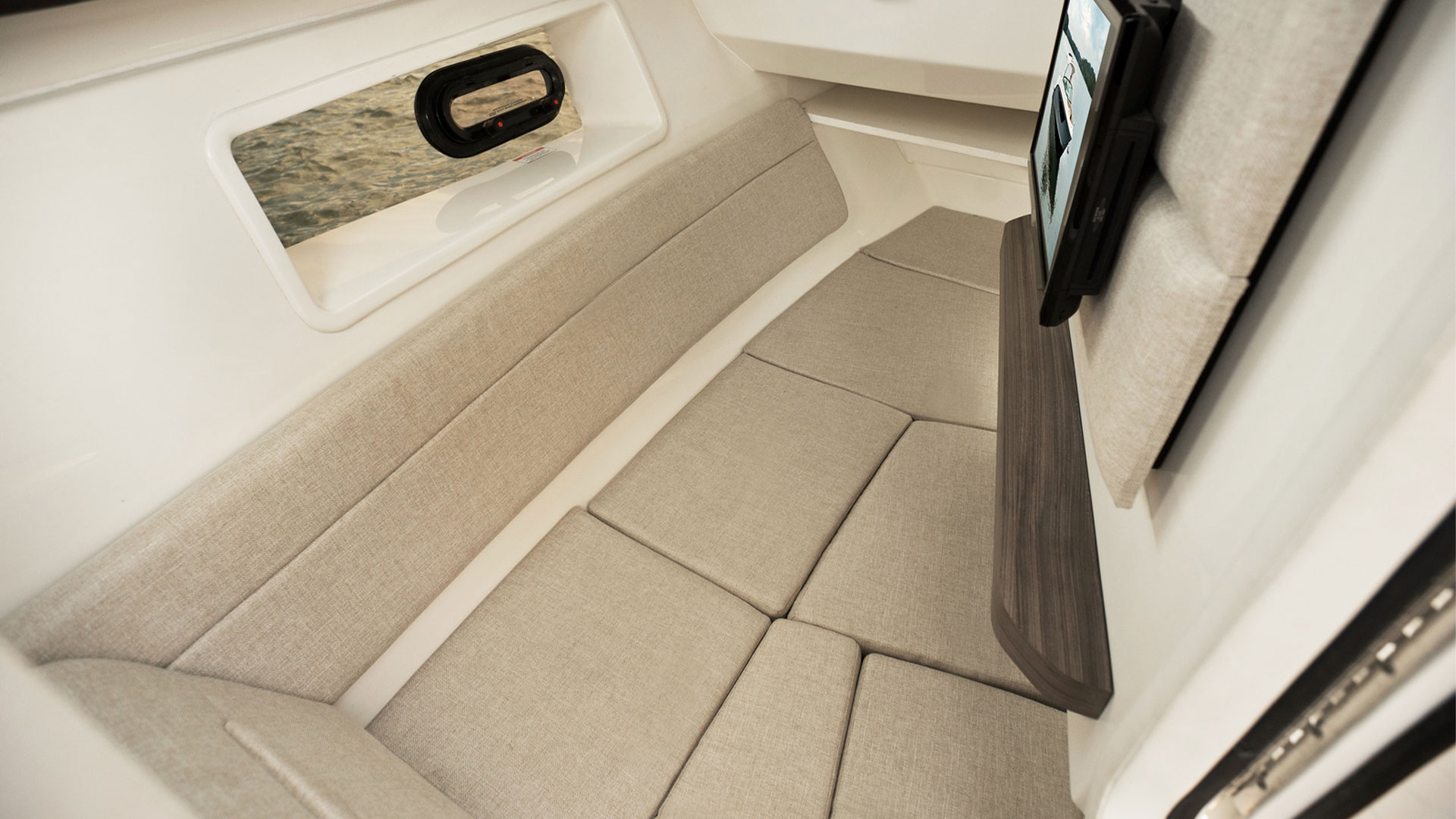 El área de popa cuenta con una amplia plataforma de baño, ideal para acceder al agua con facilidad, y un innovador respaldo abatible para maximizar el confort. En el interior, su cabina sorprende con acabados lujosos, iluminación LED, un baño cerrado con detalles en acero inoxidable y opciones de almacenamiento inteligente.