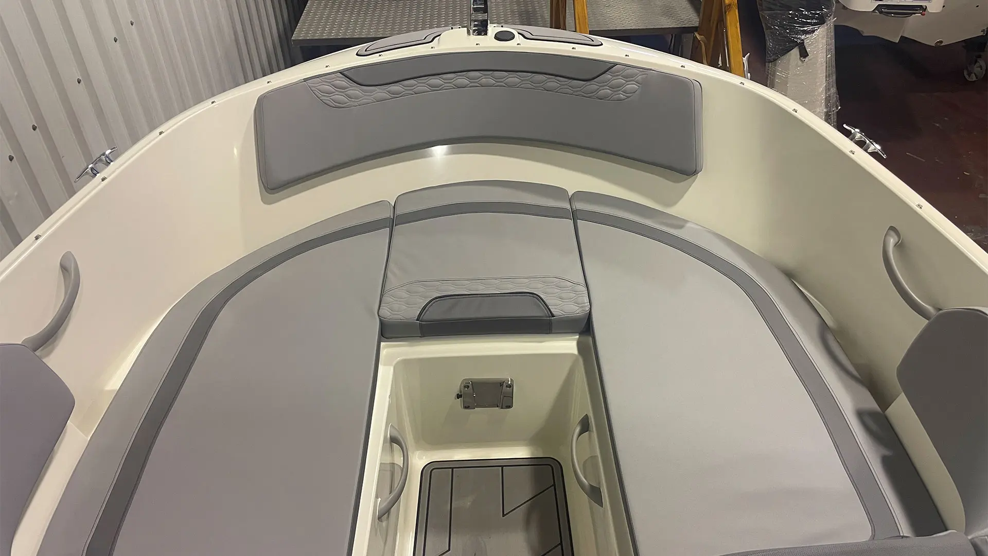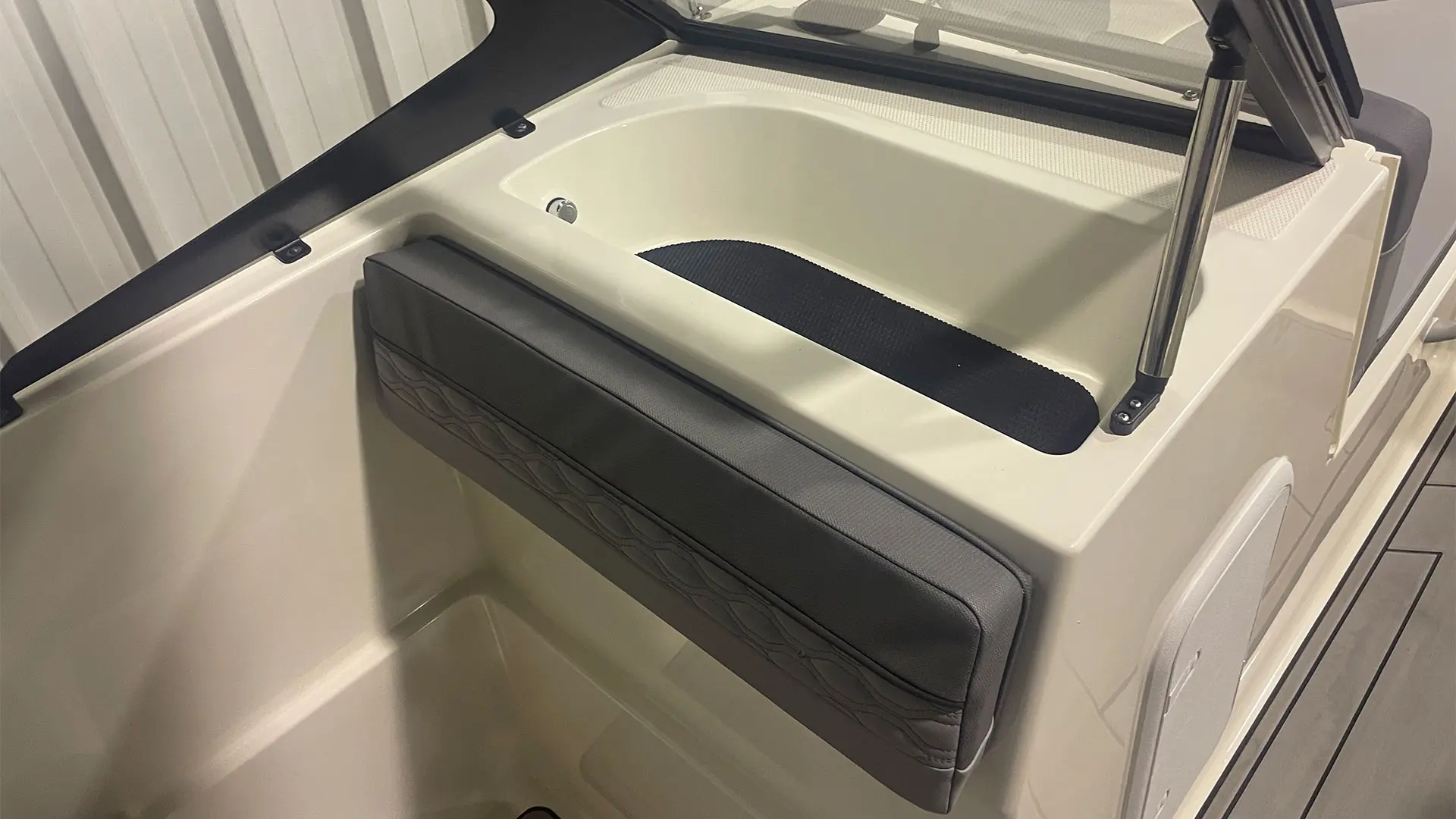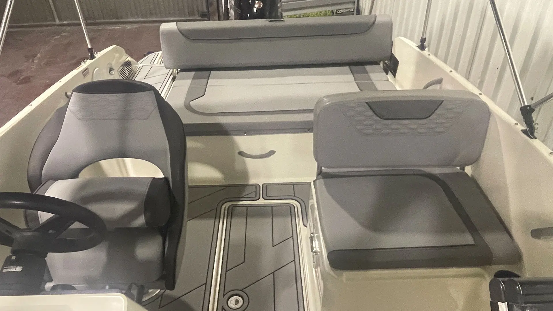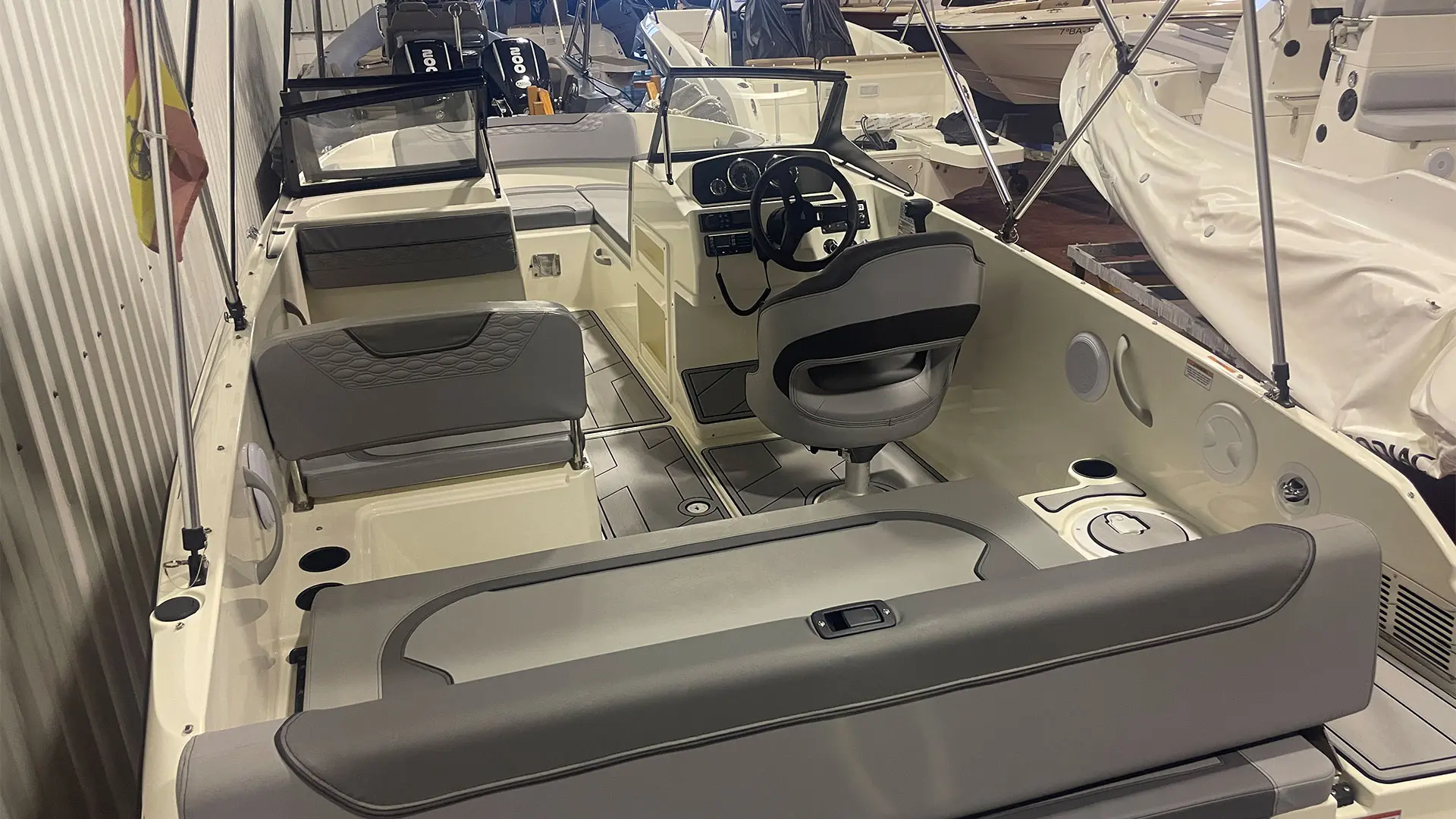 Mástil de esquí, colchoneta hueco proa, mesa de bañera, suelo en sucedáneo de teca blanda Gatorsteep color gris, parabrisas completo con apertura central, dirección hidráulica, equipo estéreo FUSION, radio VHF, toldo de sol bimini, lona de fondeo, ducha en popa.