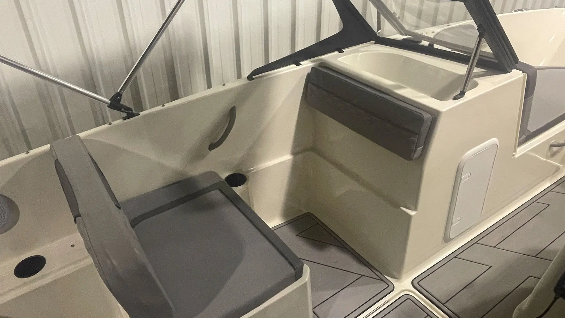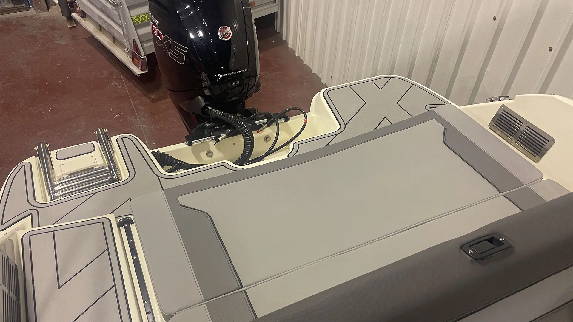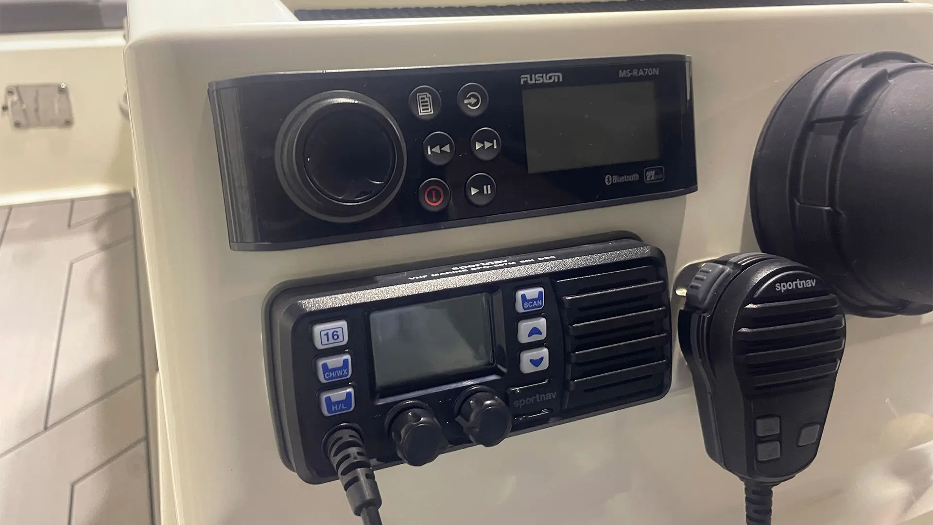 Mástil de esquí, colchoneta hueco proa, mesa de bañera, suelo en sucedáneo de teca blanda Gatorsteep color gris, parabrisas completo con apertura central, dirección hidráulica, equipo estéreo FUSION, radio VHF, toldo de sol bimini, lona de fondeo, ducha en popa.